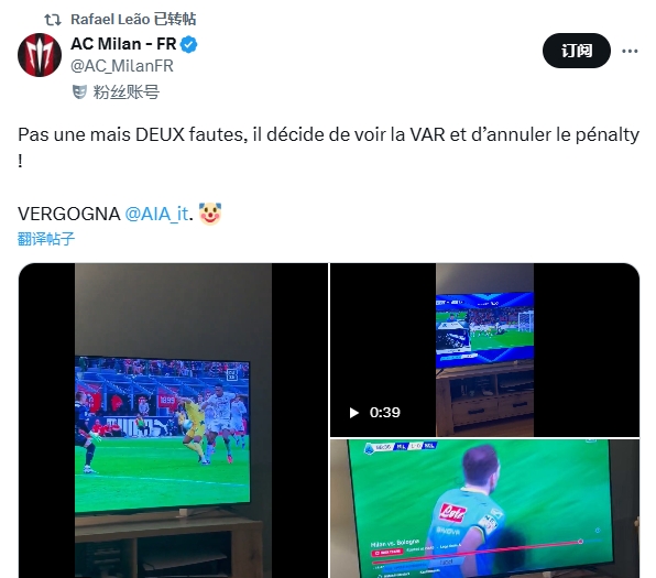 米蘭球迷社媒發(fā)文怒斥判罰:“不是一次而是兩次犯規,他決定查看VAR并取消點(diǎn)球!恥辱@AIA(意大利裁判協(xié)會(huì ))???!比R奧社媒轉發(fā)了該球迷評論。