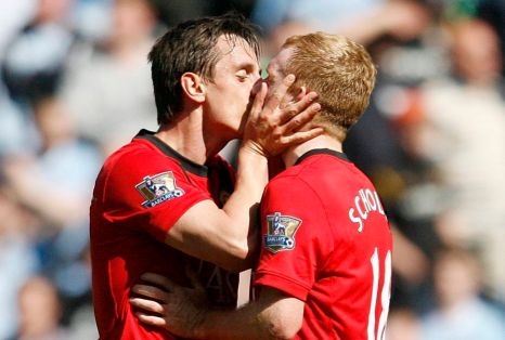2010年4月,斯科爾斯在曼市德比最后時(shí)刻打入制勝球,幫助曼聯(lián)1-0取勝。進(jìn)球后,他和內維爾在場(chǎng)上親吻,震驚全場(chǎng)。