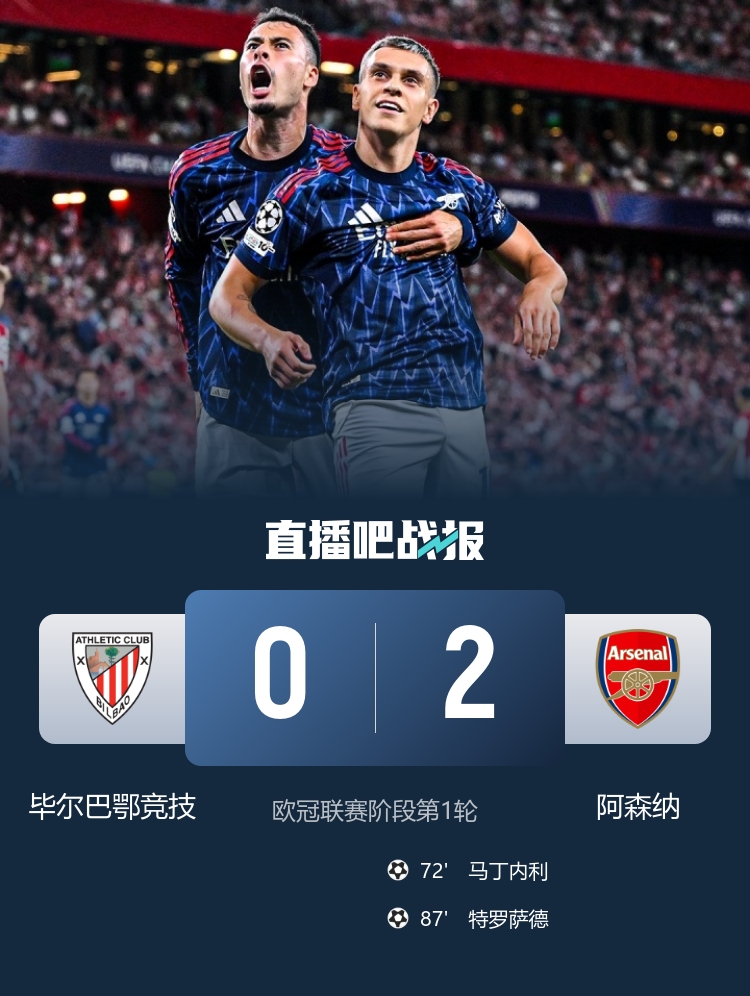 9月17日訊 北京時(shí)間0:45,歐冠聯(lián)賽階段第1輪,阿森納客場(chǎng)挑戰畢爾巴鄂競技,比賽在圣馬梅斯球場(chǎng)打響!上半場(chǎng),約克雷斯與加布里埃爾頭部相撞,前者血染賽場(chǎng)!下半場(chǎng),阿爾特塔神換人!替補登場(chǎng)的特羅薩德,助攻替補登場(chǎng)僅1分鐘的馬丁內利,后者單刀破門(mén)!比賽尾聲階段,馬丁內利投桃報李,助攻特羅薩德再下一城!兩名替補互相傳射建功!最終,阿森納2-0擊敗畢爾巴鄂競技,新賽季歐冠開(kāi)門(mén)紅!