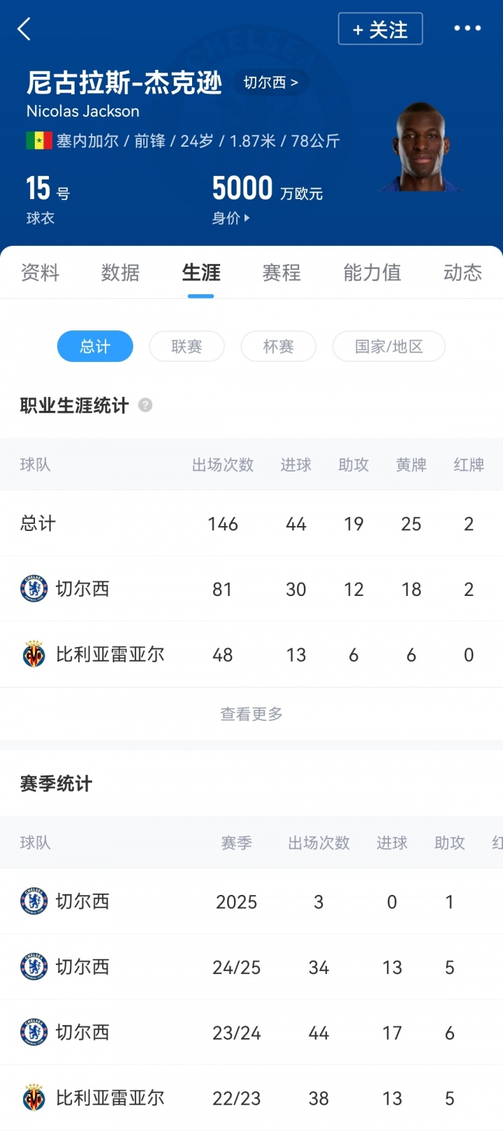 杰克遜現年24歲,加盟切爾西以來(lái)球員出場(chǎng)81次,貢獻30球12助。目前杰克遜德轉身價(jià)為5000萬(wàn)歐元。