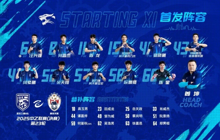 6-汪興強(60′ 62-吳浩男)、8-何鑫杰(68′ 49-鄒為威)、11-陳龍(74′ 44-譚嘉燁)、15-買(mǎi)爾旦江(90′ 51-阮景揚)、41-夏曉曦(74′ 50-蔡尚明)、43-則科如拉(90+′ 23-田成龍)、47-閔紫曦(68′ 10-高玉男)、52-余天翔、57-哈力提、58-阮景威、60-陳星