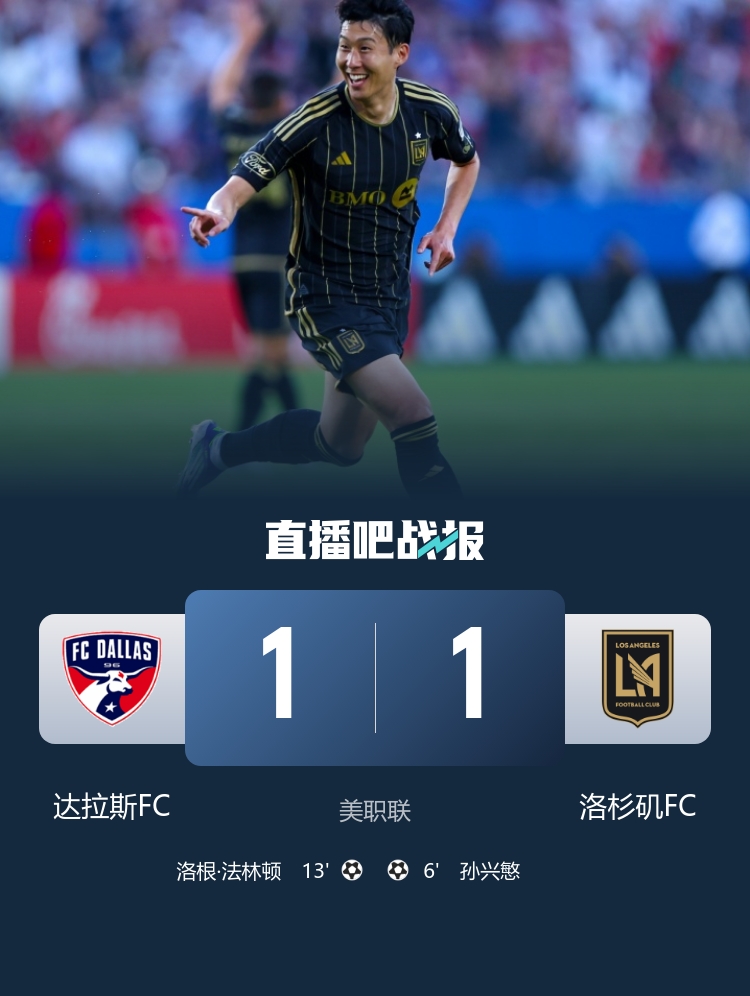 08月24日訊 美職聯(lián)達拉斯FCvs洛杉磯FC,孫興慜任意球破門(mén),洛根-法林頓扳平比分,下半場(chǎng)博安加中框,最終洛杉磯FC與對手1-1握手言和。