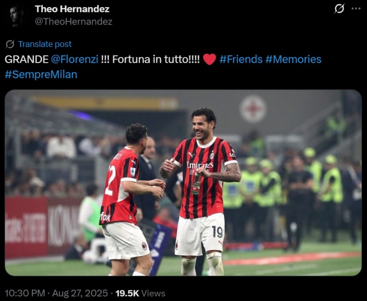弗洛倫齊的前隊友特奧更新社媒,曬出兩人共同效力米蘭時(shí)的賽場(chǎng)合照,為他送上祝福。