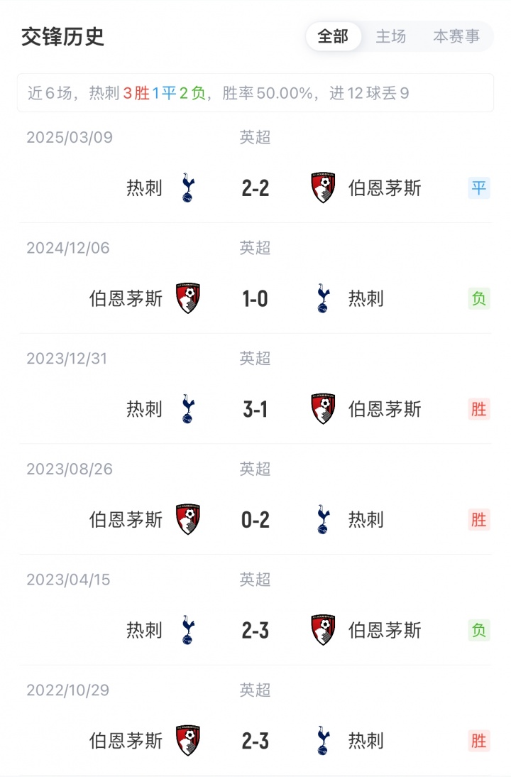 熱刺新賽季開(kāi)賽2戰全勝位列英超第二,伯恩茅斯1勝1負暫列第9。