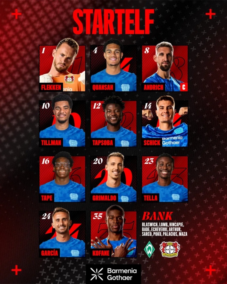 8月30日訊 21點(diǎn)30分,德甲第2輪,勒沃庫森將在客場(chǎng)對陣不萊梅。目前勒沃庫森首發(fā)陣容已出,寬薩坐鎮后防,??祟I(lǐng)銜鋒線(xiàn)。此前經(jīng)羅馬諾“HWG”確認將加盟阿森納的后衛因卡皮耶入選替補名單。具體如下:
