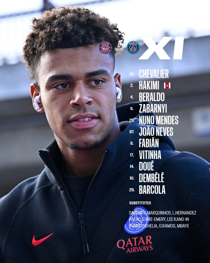 30-舍瓦利耶、2-阿什拉夫、4-貝拉爾多、6-扎巴爾尼、25-努諾-門(mén)德斯、87-若昂-內維斯、8-法比安-魯伊斯、17-維蒂尼亞、14-杜埃、10-登貝萊、29-巴爾科拉