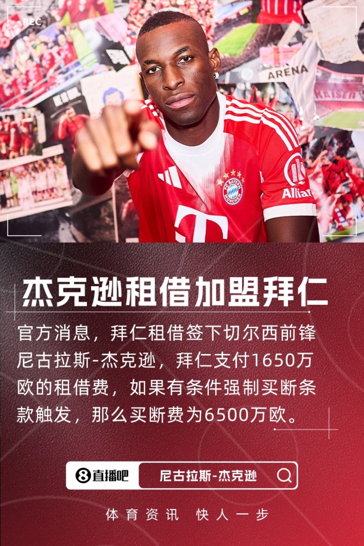 根據此前報道,拜仁支付1650萬(wàn)歐的租借費,如果有條件強制買(mǎi)斷條款觸發(fā),那么買(mǎi)斷費為6500萬(wàn)歐,并且切爾西會(huì )有10%的二次轉會(huì )分成。同時(shí),如果觸發(fā)強制買(mǎi)斷條款,杰克遜會(huì )和拜仁簽約至2031年。