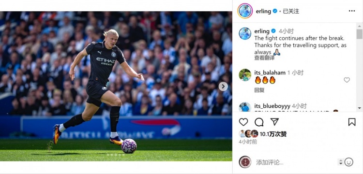 這是哈蘭德出戰的第100場(chǎng)英超比賽,他取得進(jìn)球,但曼城落敗,賽后哈蘭德在社交媒體上寫(xiě)道:“休賽期后戰斗繼續,感謝球迷在客場(chǎng)一如既往的支持?!?/p>