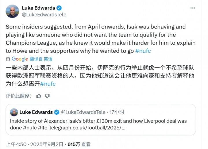 這家英國全國性報紙被認為是每日電訊報,每日電訊報今夏持續報道伊薩克轉會(huì )鬧劇的紐卡跟隊Luke Edwards今晨發(fā)帖表示,伊薩克從四月份起就表現得像不希望球隊獲得歐冠資格一樣。
