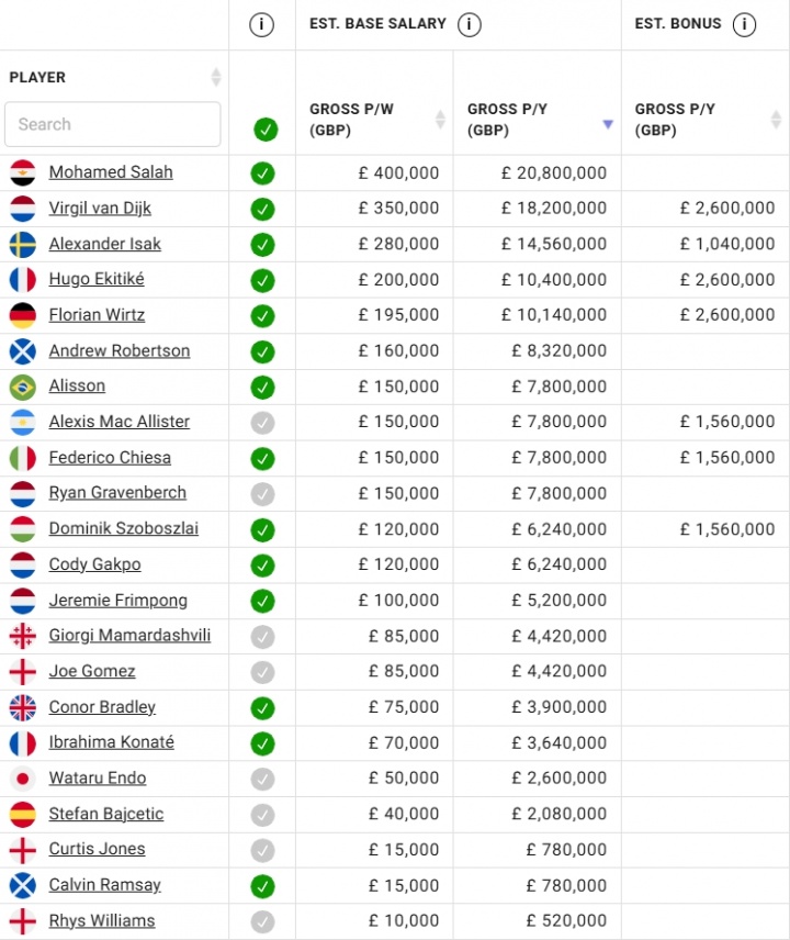 目前利物浦20萬(wàn)鎊以上的頂薪球員已經(jīng)有4個(gè),薩拉赫(40萬(wàn))、范迪克(35萬(wàn))、伊薩克(28萬(wàn))和?;倏耍?0萬(wàn)),而維爾茨(19.5萬(wàn))也很接近20萬(wàn)。