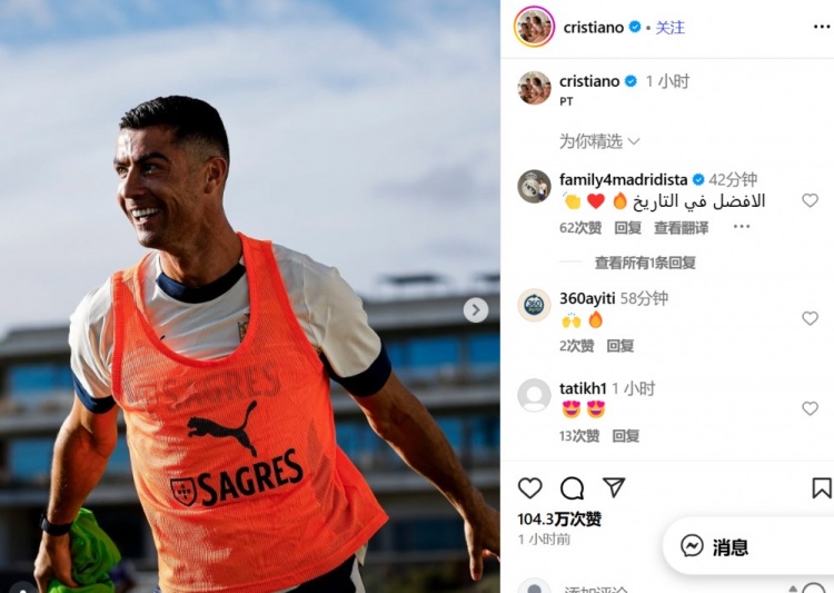 9月4日訊 不久前,C羅更新了社交媒體,曬出了在葡萄牙國家隊的訓練照。