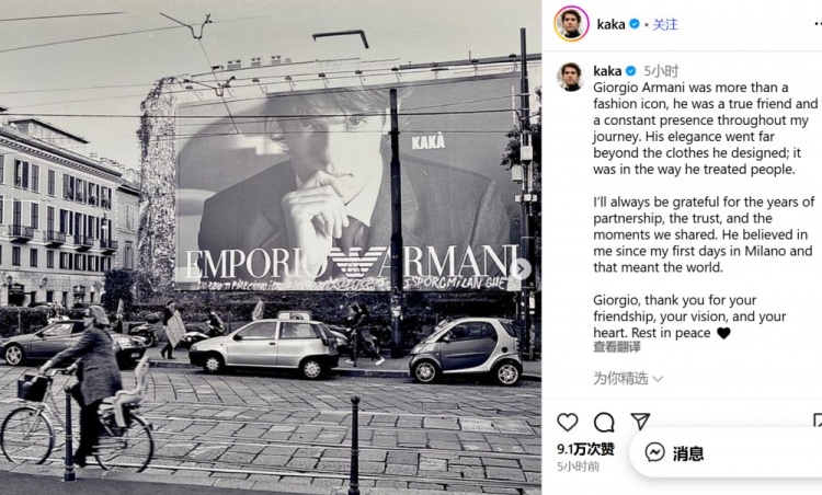 9月5日訊 不久前,卡卡更新社交媒體,緬懷了昨日離世的喬治-阿瑪尼。