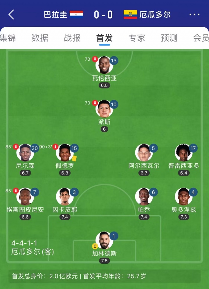 “鐵腰”凱塞多因傷缺席本場(chǎng)比賽,厄瓜多爾首發(fā)的后防線(xiàn)有剛加盟阿森納的因卡皮耶、巴黎的帕喬、米蘭的埃斯圖皮尼安、布魯日21歲新星奧多涅茲。