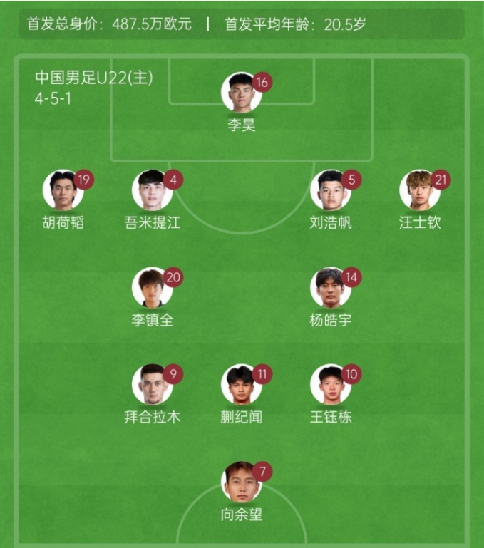 上場(chǎng)U22國足2-1東帝汶U23首發(fā):16-李昊、4-吾米提江、5-劉浩帆、19-胡荷韜、21-汪士欽、10-王鈺棟、11-蒯紀聞、14-楊皓宇、20-李鎮全、7-向余望、9-拜合拉木