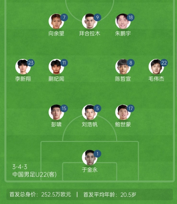 本場(chǎng)中國U22首發(fā)(標粗為與上場(chǎng)不同的首發(fā)球員):1-于金永、5-劉浩帆、15-彭嘯、17-鮑世蒙、8-陳哲宣、11-蒯紀聞、22-毛偉杰、23-李新翔、7-向余望、9-拜合拉木、18-朱鵬宇