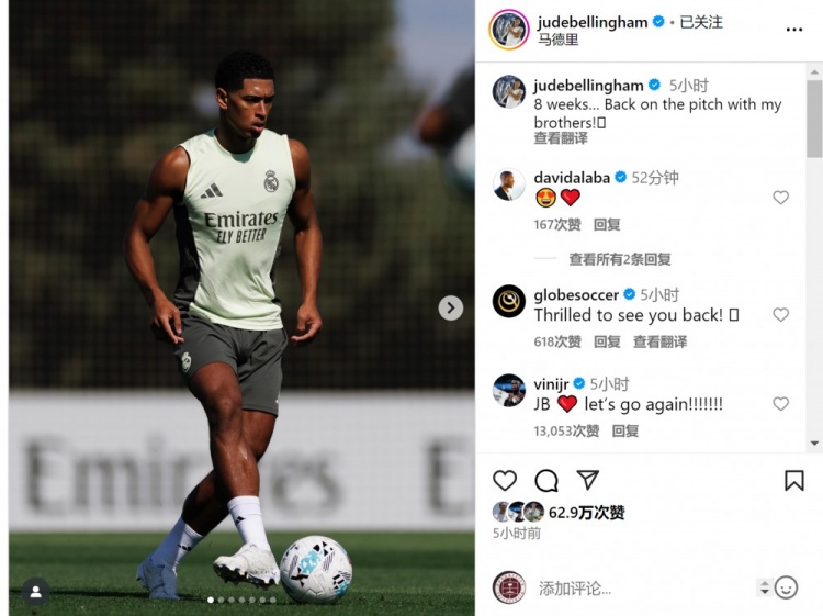 貝林厄姆社媒曬出訓練照片,配文:“(缺席)8周,終于回到球場(chǎng)與我的兄弟們在一起?!?/p>