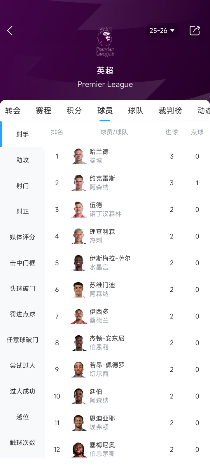 英超射手榜: