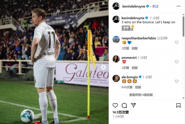德布勞內寫(xiě)道“:連勝3場(chǎng)!讓我們繼續加油??”
