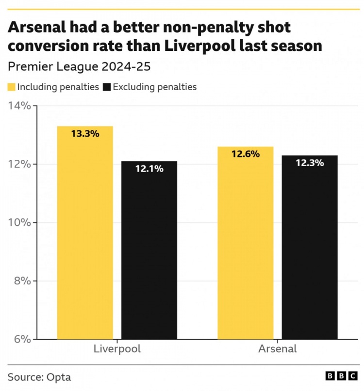 上賽季阿森納的非點(diǎn)球破門(mén)效率比利物浦更高