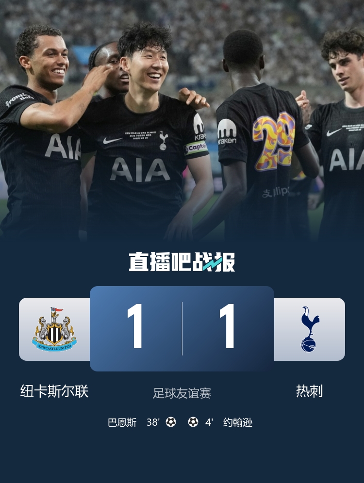 上半場(chǎng)補時(shí)3分鐘,熱刺1-1紐卡。