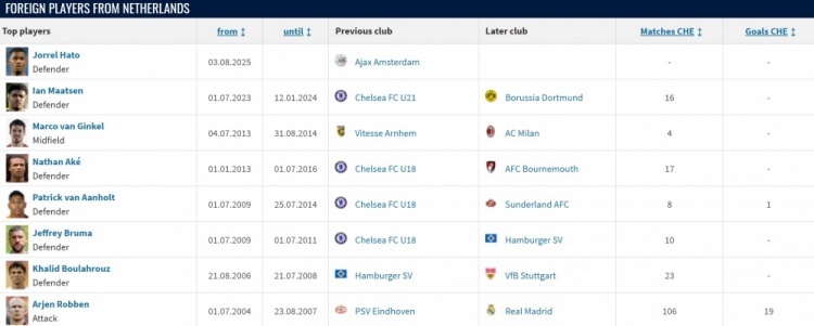 8月4日訊 切爾西官宣荷蘭籍后衛哈托加盟球隊,球隊官方列出了隊史荷蘭籍球員,在哈托之前共有14名球員。