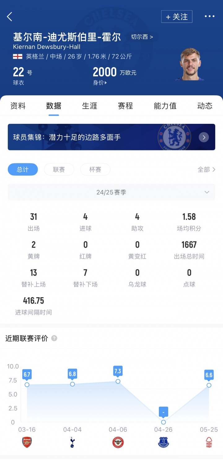 26歲的霍爾去年夏窗以3540萬(wàn)歐元轉會(huì )費從萊斯特城加盟切爾西,上賽季為切爾西出場(chǎng)31次貢獻4球4助。球員目前的身價(jià)為2000萬(wàn)歐元。