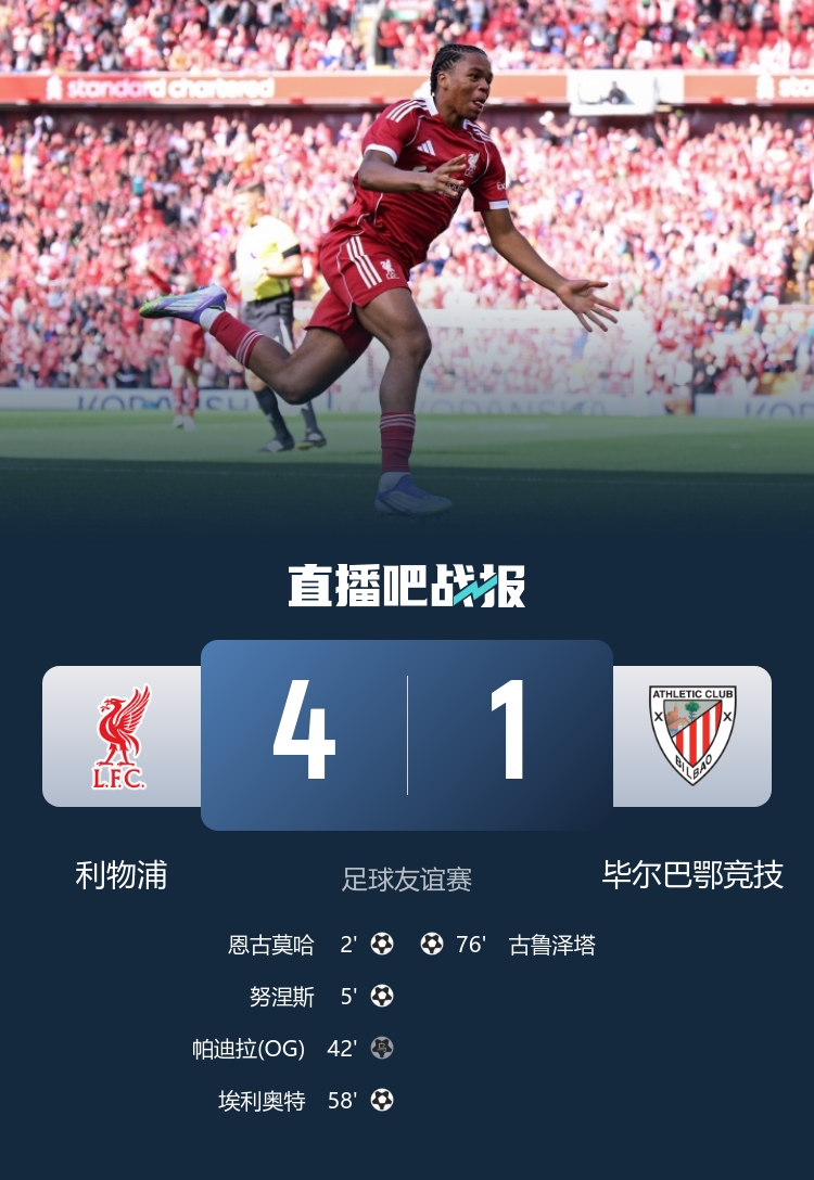 利物浦與畢巴進(jìn)行連續熱身賽,首場(chǎng)對決,利物浦4-1取勝,恩古莫哈、努涅斯與埃利奧特取得進(jìn)球。