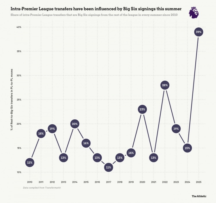 今年夏窗,39%的英超內部轉會(huì )屬于“BIG6”從聯(lián)賽其他球隊收購球員——這是自2010年以來(lái)的最高比例。