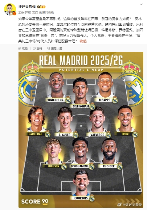 08月05日訊 知名評述員詹俊在個(gè)人社媒上曬出了皇馬新賽季的潛在首發(fā)示意圖,并對此進(jìn)行了評論。