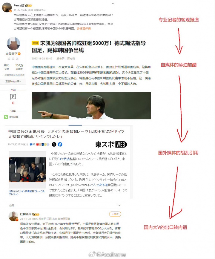 王曉瑞:韓國媒體的爆料基本都是援引“中國自媒體”。某門(mén)戶(hù)自媒體天天編造假新聞,關(guān)鍵是國內圈里人都知道這不靠譜,韓國記者們都信以為真,然后援引中國自媒體在那加工版胡編濫造,然后中國球迷看到韓國媒體撰文,又以為是韓國媒體爆料,殊不知是以訛傳訛。關(guān)鍵是這種事根本沒(méi)有人管,前幾天韓國媒體還在那YY某中國國腳打假球,結果仔細一看還是援引中國自媒體的胡編。對此現象,只能四字總結:“太丟人了”,而且非常影響國際形象,關(guān)鍵還都是無(wú)中生有的事情,真是得需要有人管一管。