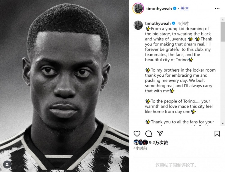 蒂莫西-維阿社媒寫(xiě)道:“從一個(gè)夢(mèng)想登上大舞臺的小男孩,到身披尤文黑白戰袍的球員,感謝你們讓這個(gè)夢(mèng)想成真。我將永遠感激這家俱樂(lè )部、我的隊友、球迷以及美麗的都靈城。