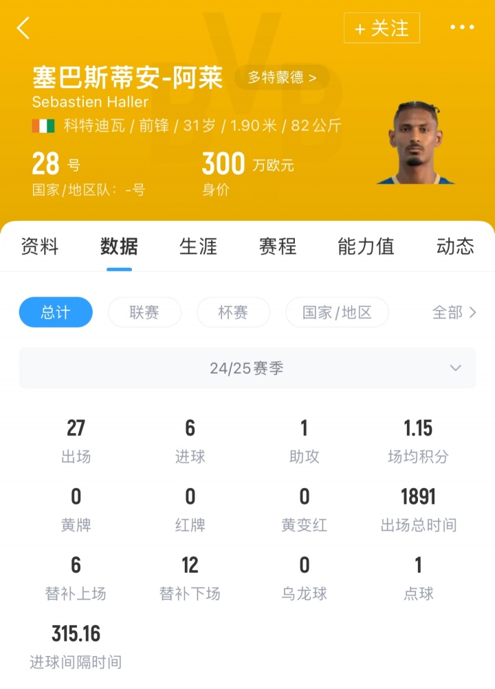上賽季,阿萊為多特出場(chǎng)27場(chǎng),取得了6粒進(jìn)球和1次助攻,目前其德轉身價(jià)為300萬(wàn)歐。