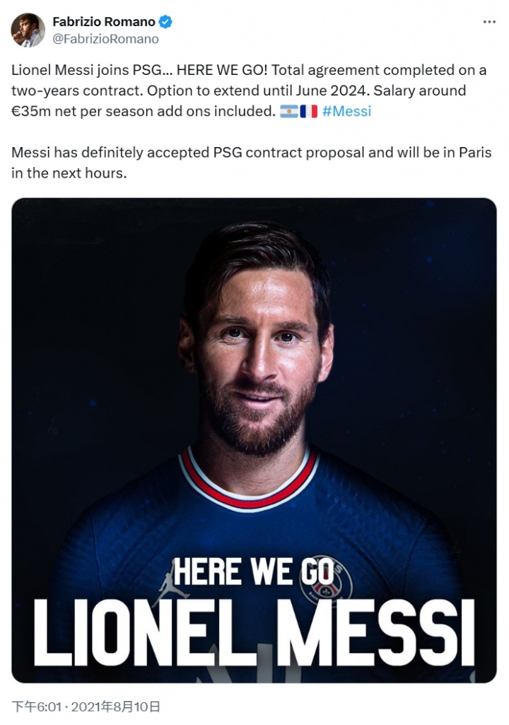 當時(shí)羅馬諾的“Here We Go”↓三個(gè)半小時(shí)后巴黎官宣,隨即梅西身穿“這里是巴黎”的T恤亮相機場(chǎng)。