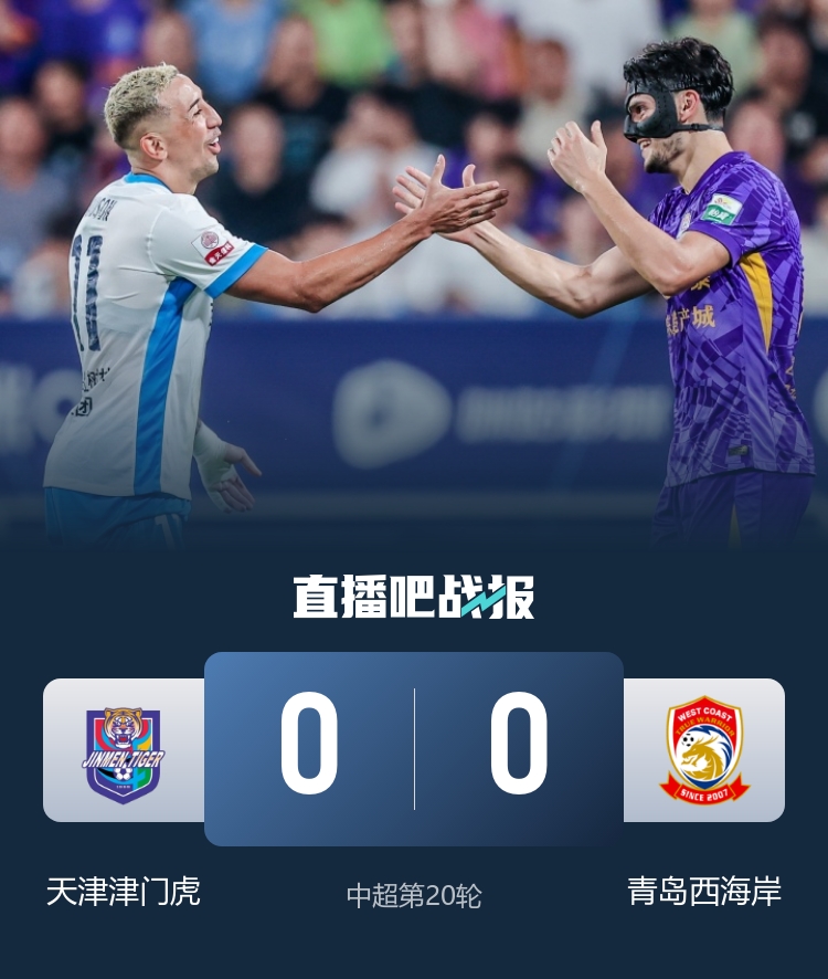 全場(chǎng)比賽結束,天津津門(mén)虎0-0青島西海岸。