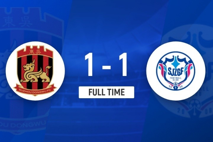 傷停補時(shí)8分鐘。全場(chǎng)比賽結束,蘇州東吳1-1石家莊功夫。