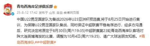 中國U22男足國家隊為備戰2026年U23亞洲杯預選賽,將于8月25日開(kāi)始進(jìn)行集訓,為保障U22男足國家隊備戰,同時(shí)保證中超聯(lián)賽平穩有序進(jìn)行,經(jīng)多方溝通后,研究決定將原定于8月30日(周六19:35)中超聯(lián)賽第23輪青島西海岸隊客場(chǎng)對陣大連英博海發(fā)的比賽,調整為10月4日(周六19:35),請廣大球迷朋友知悉。