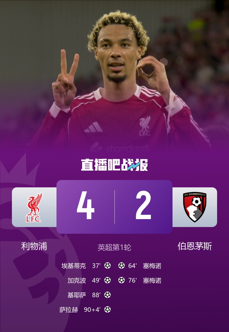 8月16日訊 25-26賽季英超揭幕戰,衛冕冠軍利物浦坐鎮主場(chǎng)安菲爾德迎戰伯恩茅斯。上半場(chǎng),薩拉赫、范迪克造險,?;倏诉B場(chǎng)破門(mén)并致敬若塔。易邊再戰,?;倏酥ゼ涌瞬ńü?,塞梅諾雙響,小基耶薩替補絕殺,薩拉赫鎖定勝局。最終利物浦4-2伯恩茅斯收獲開(kāi)門(mén)紅。