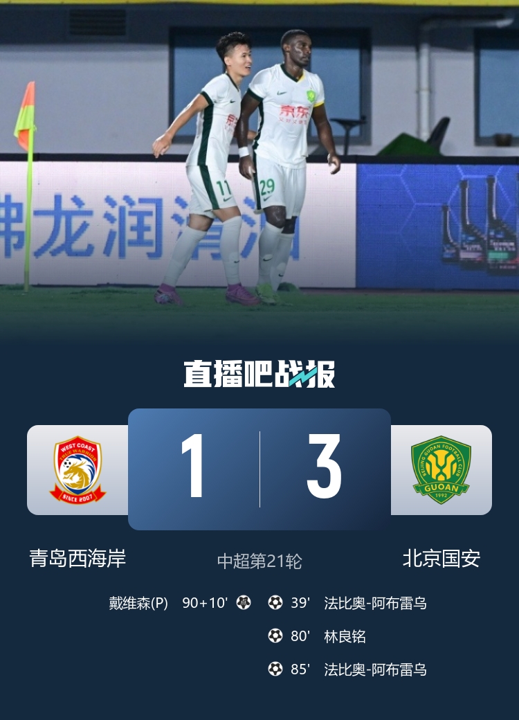 全場(chǎng)比賽結束,最終北京國安3-1青島西海岸。