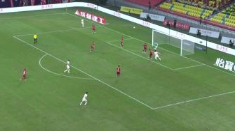 第33分鐘,韋林頓-席爾瓦獲得辦單刀機會(huì ),蹇韜出擊將球封堵,席爾瓦得球傳后點(diǎn),車(chē)世偉頭球攻門(mén),蹇韜飛身將球撲出?!?/p>
