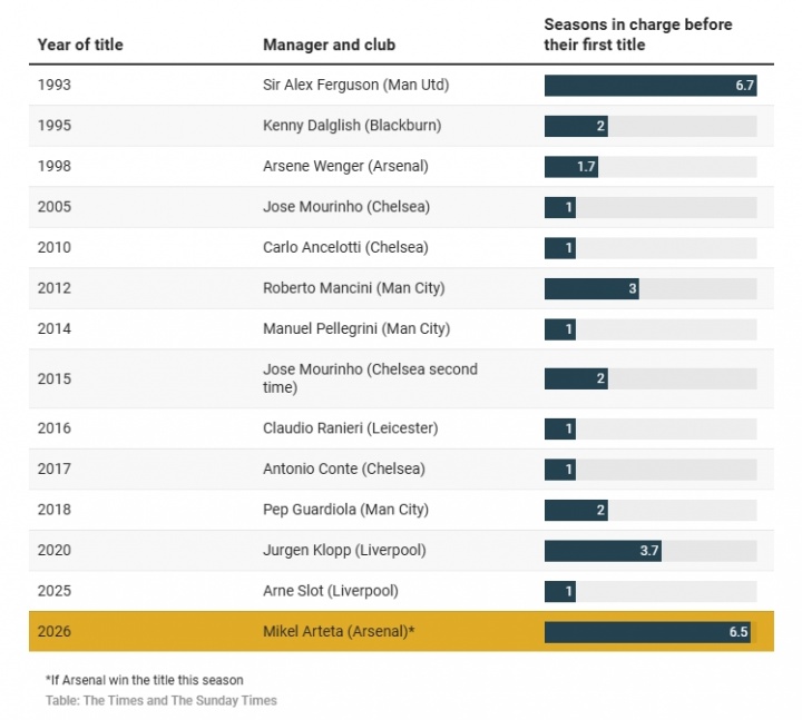 若本賽季阿爾特塔率阿森納問(wèn)鼎英超,這將成為英超時(shí)代除弗格森爵士(曼聯(lián))外,俱樂(lè )部等待主帥首奪聯(lián)賽冠軍最久的案例。