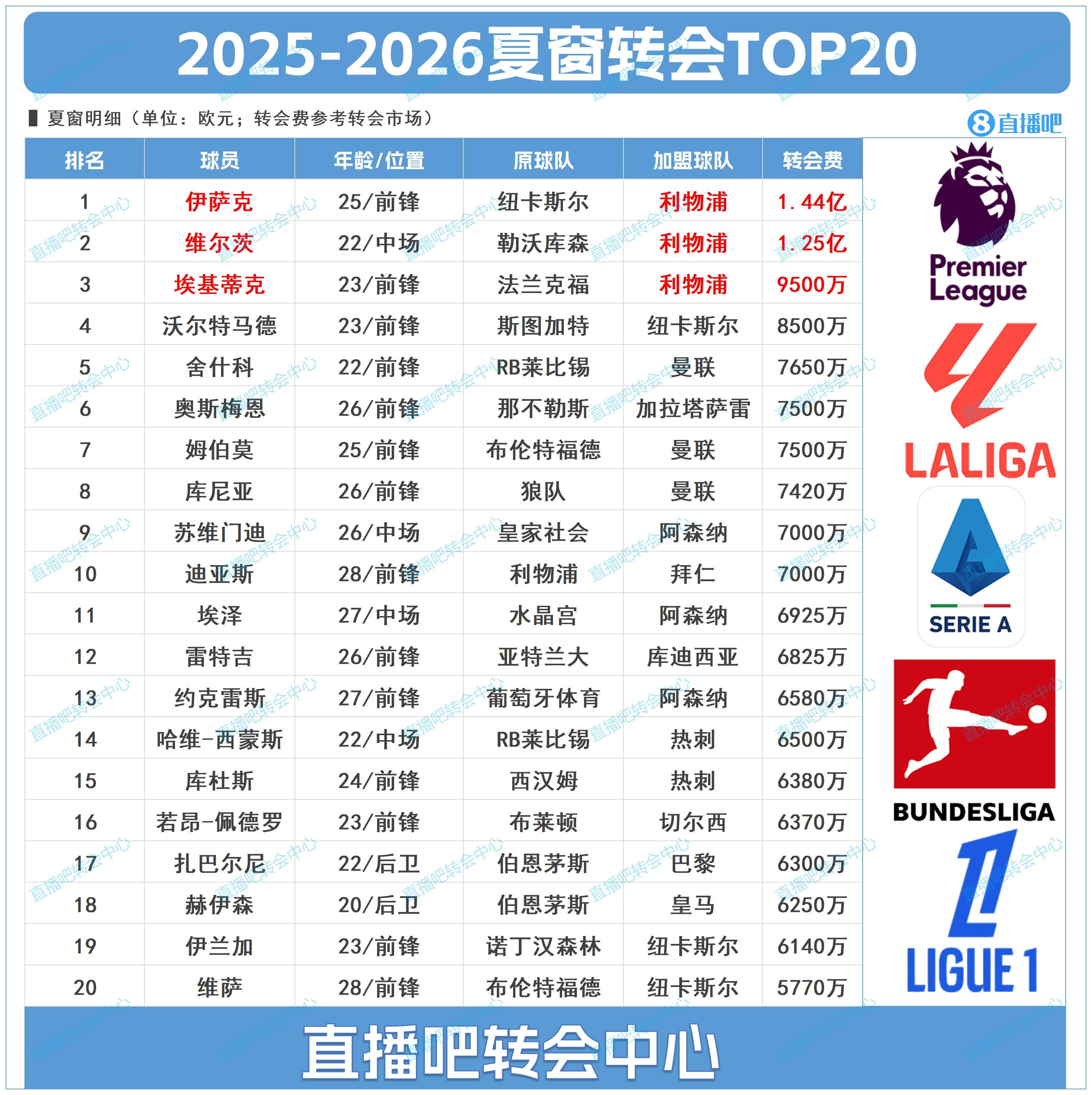 2025夏窗轉會(huì )TOP20【注:數據參考德國轉會(huì )市場(chǎng)網(wǎng)】