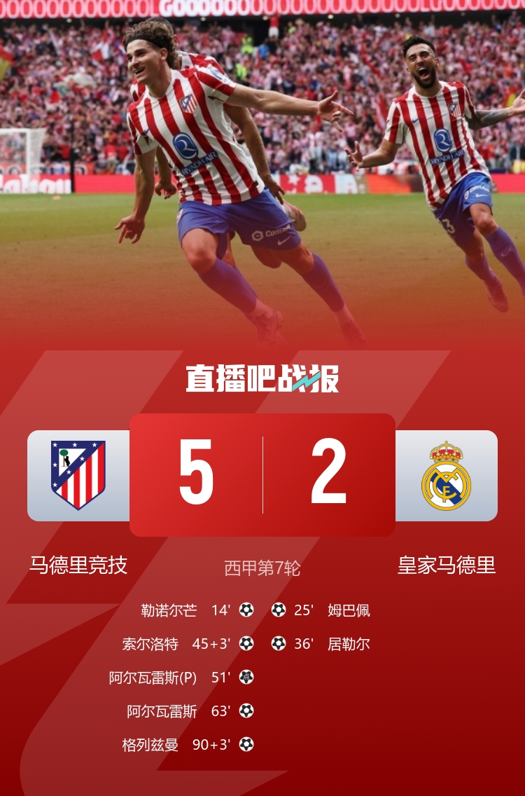 9月27日訊 北京時(shí)間9月27日22:15,西甲第7輪馬競迎戰皇馬的比賽在大都會(huì )球場(chǎng)進(jìn)行,上半場(chǎng)索爾洛特開(kāi)場(chǎng)失單刀,小西蒙尼助攻勒諾爾芒頭球首開(kāi)記錄,居勒爾助攻姆巴佩單刀推射扳平比分,隨后維尼修斯助攻居勒爾抽射反超比分,阿爾瓦雷斯遠射中柱,補時(shí)索爾洛特頭球扳平比分,半場(chǎng)結束,皇馬2-2馬競。下半場(chǎng)居勒爾送點(diǎn)阿爾瓦雷斯點(diǎn)射破門(mén),隨后阿爾瓦雷斯任意球直接破門(mén),格列茲曼替補建功,最終馬競5-2送皇馬聯(lián)賽首敗,馬競收獲兩連勝。