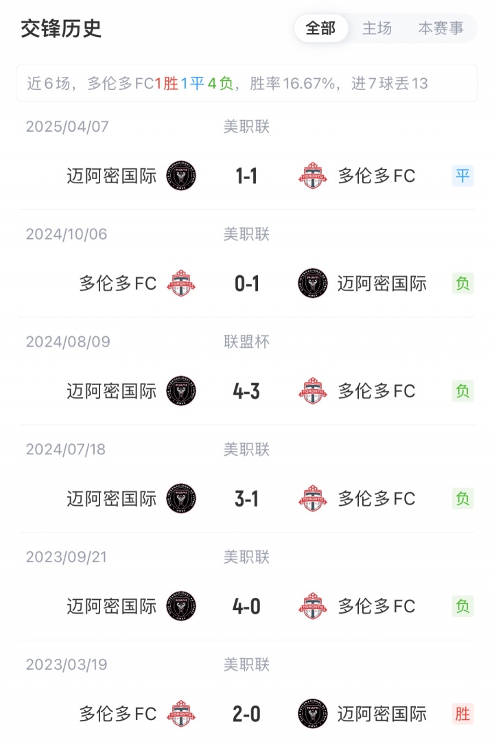 積分榜方面,邁阿密?chē)H16勝7平6負積55分,近期收獲3連勝;多倫多FC5勝12平13負積27分,近8輪不勝且收獲6連平。邁阿密?chē)H歷史對陣多輪多FC已5場(chǎng)不?。?勝1平)。