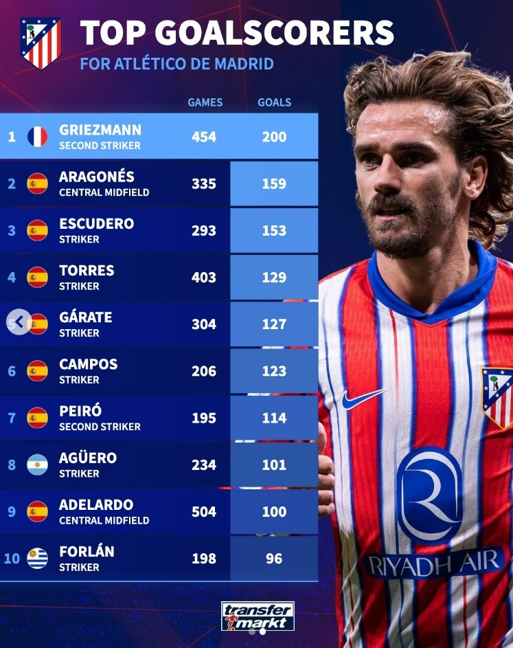 10月1日訊 在本輪歐冠馬競5-1擊敗法蘭克福的比賽中,格列茲曼打進(jìn)個(gè)人馬競生涯第200球。德轉也盤(pán)點(diǎn)了馬競隊史射手榜,其中格列茲曼居首,具體如下: