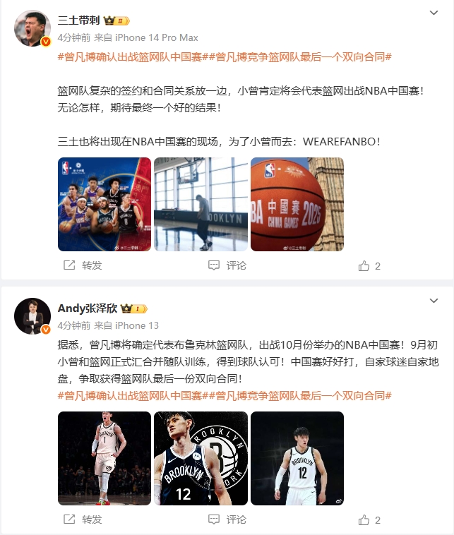 媒體人@Anay張澤欣和@三土帶刺也有類(lèi)似報道,其中前者表示曾凡博9月初和籃網(wǎng)會(huì )合隨隊訓練,得到球隊認可。