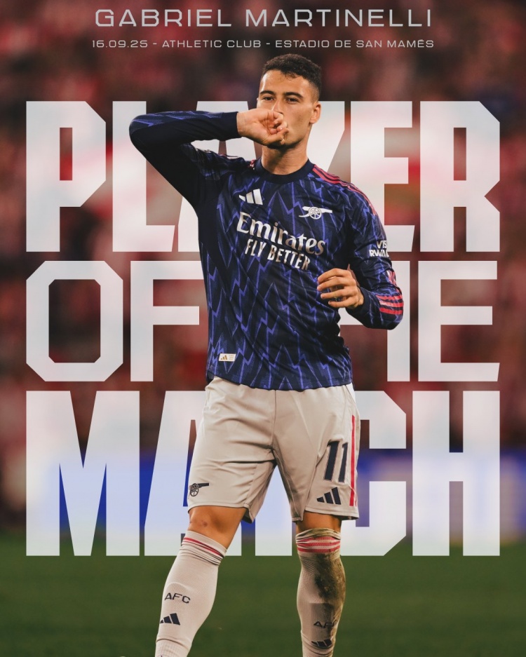 此役馬丁內利71分鐘為阿森納替補出場(chǎng),貢獻1傳1射,他當選本場(chǎng)比賽最佳球員。