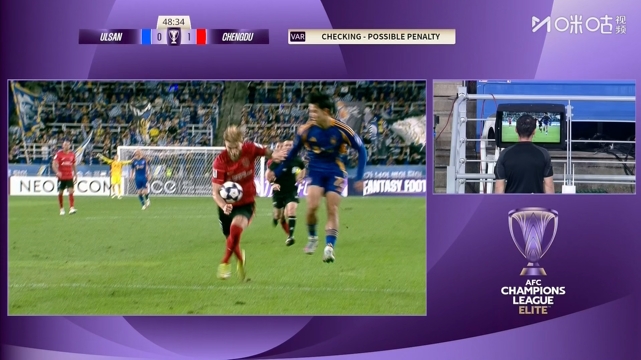 09月17日訊 亞冠精英聯(lián)賽東亞區第1輪,成都蓉城客場(chǎng)對陣蔚山HD,比賽第48分鐘,蓉城禁區內皮球先打到萊切特身體隨后擊中他的手臂,VAR介入檢查,隨后主裁判來(lái)到場(chǎng)邊回看,最終維持了沒(méi)有點(diǎn)球的判罰。