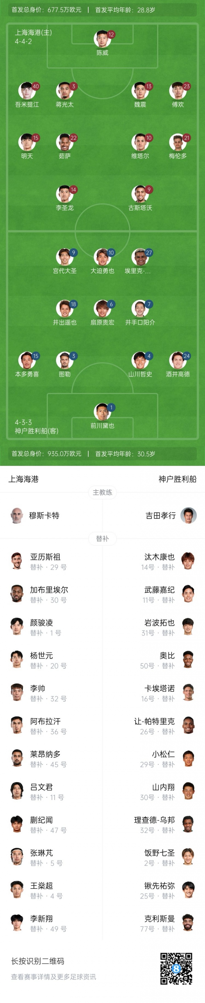 09月17日訊 北京時(shí)間20:15,亞冠精英聯(lián)賽東亞區第1輪,上海海港主場(chǎng)對陣神戶(hù)勝利船,賽前首發(fā)陣容公布,海港先發(fā)4外援,但也在陣容上做出了一定的輪換,陳威、傅歡、明天、李圣龍先發(fā),顏駿凌、張琳芃、李新翔、蒯紀聞替補待命。