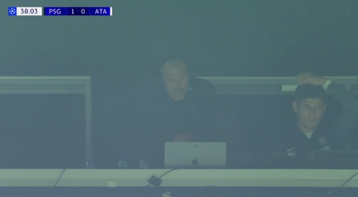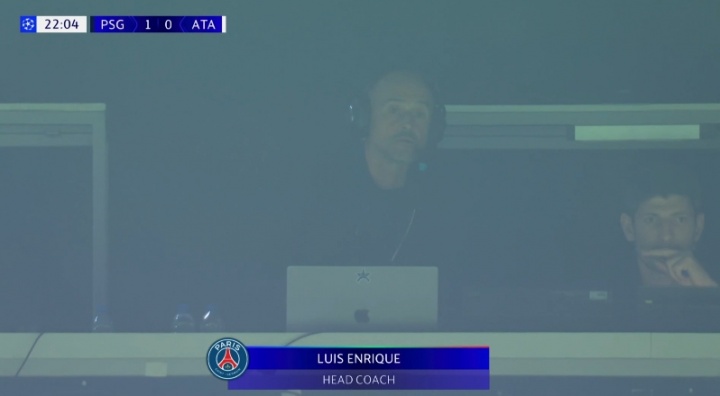 比賽第23分鐘,轉播鏡頭給到巴黎主帥恩里克,他出現在看臺上,頭戴耳機指揮著(zhù)球隊。