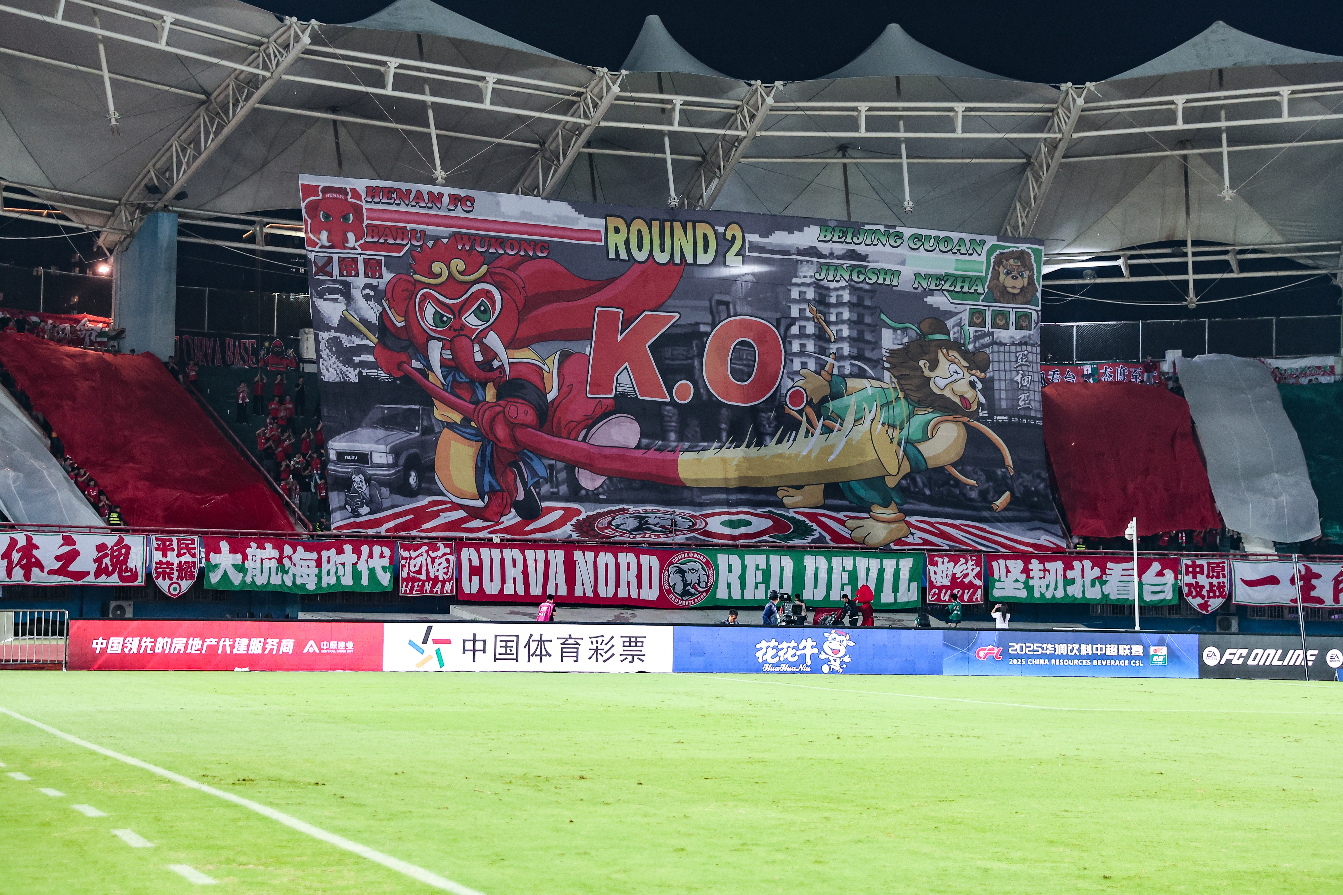 以下為9月12日河南主場(chǎng)vs國安的現場(chǎng)TIFO。有媒體人指出,TIFO左下角的圖案元素不合規。